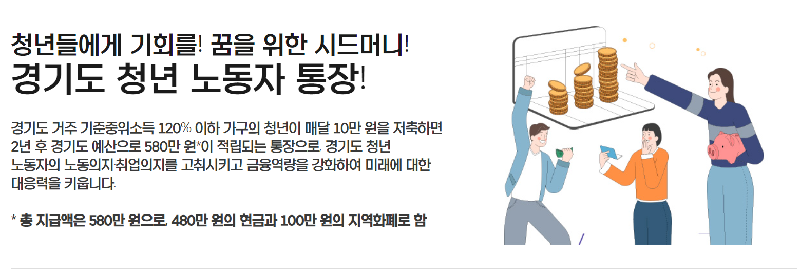 경기도 청년 노동자 통장이란 경기도 거주 기준 중위소득 120% 이하 가구의 청년이 매달 10만 원을 저축하면 2년 후 경기도 예산으로 580만 원이 적립되는 통장입니다. 경기도 청년 노동자의 노동의지, 취업의지를 고취시키기 위해 이 사업이 만들어졌는데요. 이번에 13기 신규 접수를 한다고 합니다.