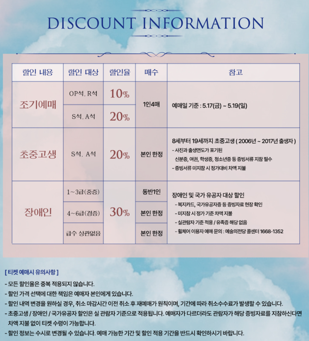 5월 19일까지 조기예매 시 OP석, R석은 10% 할인을 받을 수 있습니다. S석 A석의 경우에는 20% 할인이 적용되며, 초중고생 할인으로 S석 A석 20% 할인이 적용됩니다.