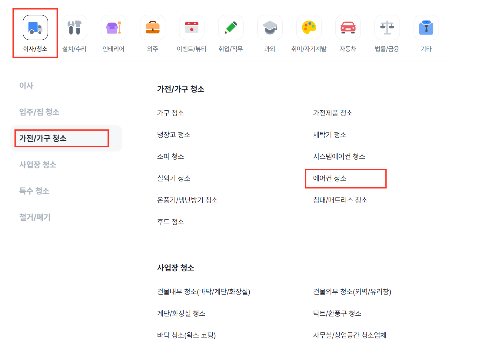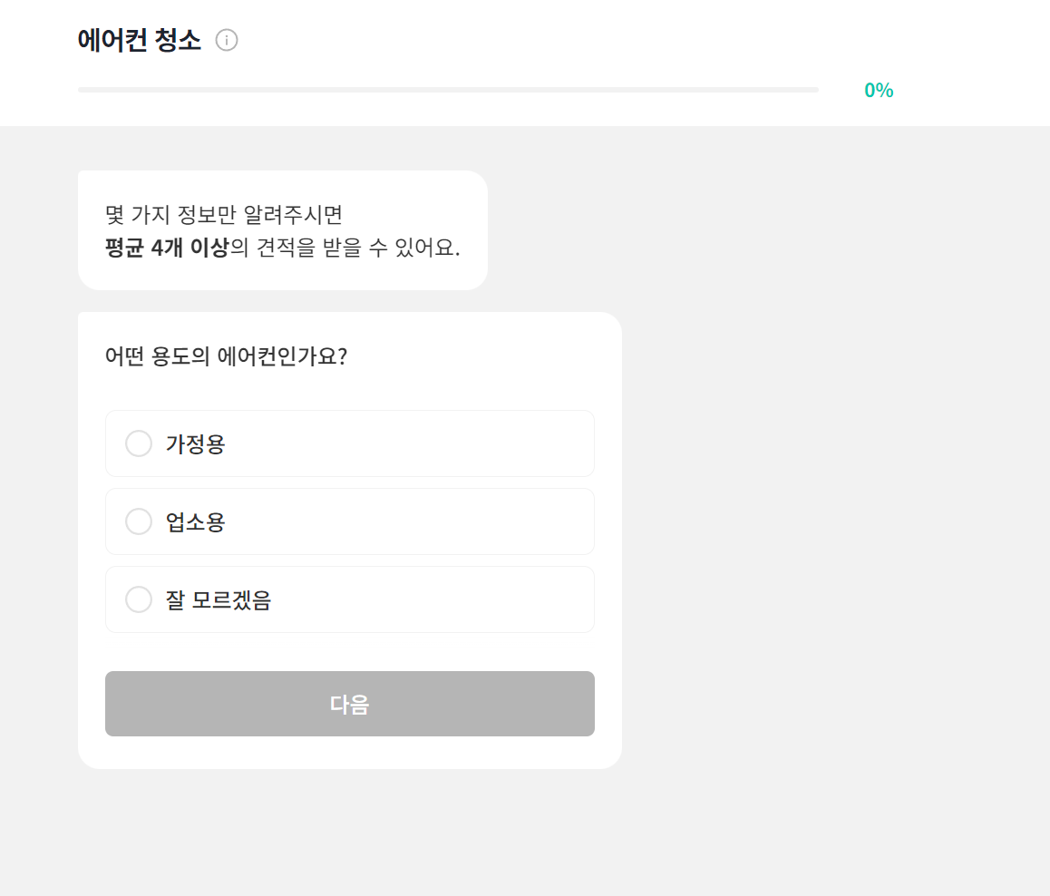 숨고는 "숨은 고수"의 줄임말로 여러 가지 서비스를 중개해주고 있는 사이트입니다. 이곳에서 에어컨 청소 서비스에 대해 무료 견적을 받아볼 수 있습니다. 이사/청소 부분을 클릭하신 뒤 가전/가구 청소에서 에어컨 청소를 누르시면 견적을 받아보실 수 있습니다.